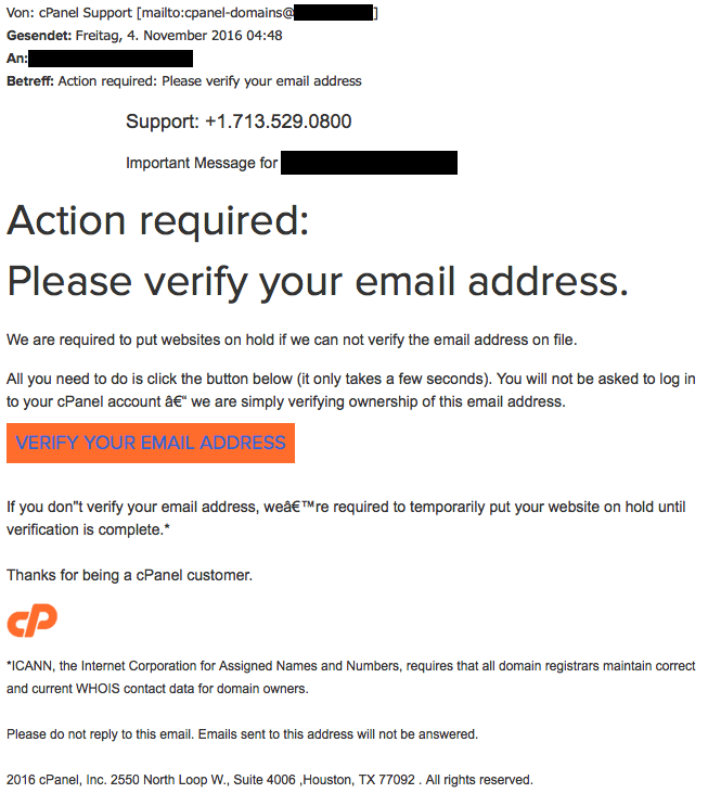 Diese EMail stammt NICHT von cPanel - Es handelt sich um eine Phishing EMail! Bitte folgenden Sie weder den Anweisungen noch dem Link aus der EMail!